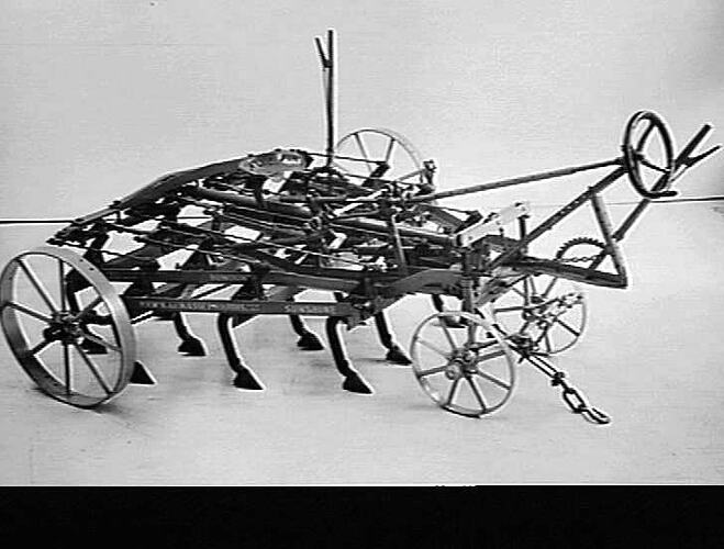 A standard horse-drawn 'SunDuke' scarifier fitted with tractor screw-lift for rear-wheel height adjustment and a tractor-lever for front-wheel depth control. Implements were made in 1o, 12, 14, 16, 18 and 20-tyne sizes with varying points to meet soil conditions.