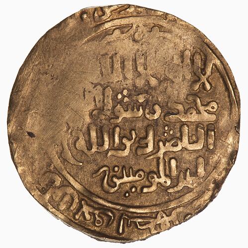 Dinar coin issued by Genghis Khan (Chingiz Khan) for the Mongul Empire. Struck at the Ghazana mint, Afghanistan in 618 AH (1221-1222 AD).