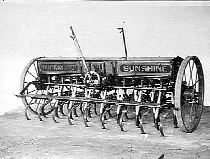 Rear view of an early Model H.V. McKay 'Suntyne' seed and fertilizer drill. The lever raises and lowers the tynes.