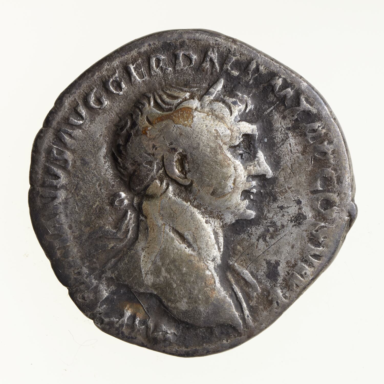 Laureate head of Trajan facing right, drapery on left shoulder; around, IMP TRAIANO AVG GER DAC PM TR P COS VI P P