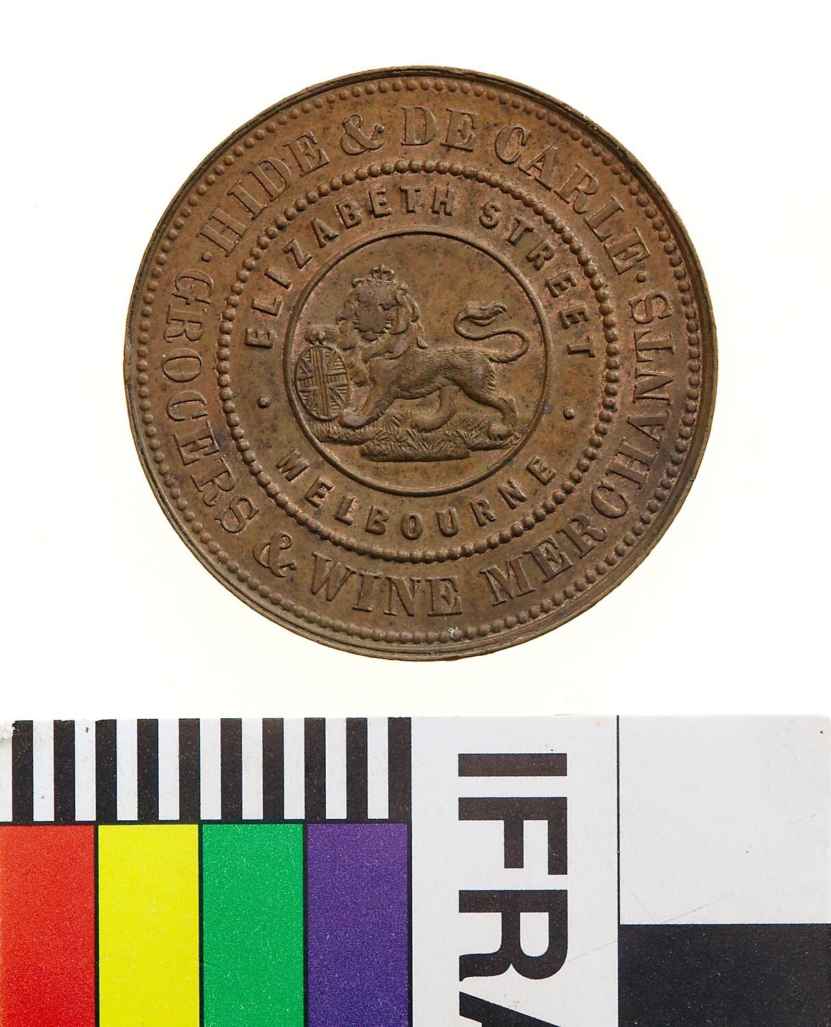 Obverse: HIDE & DE CARLE. GROCERS & WINE MERCHANTS ELIZABETH STREET MELBOURNE Reverse: MELBOURNE, VICTORIA. 1858