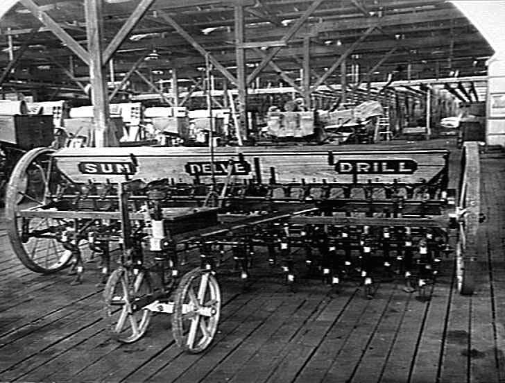 An early Model 'Sundelve' seed and fertilizer drill. Photo taken in the assembly section of the H.V. McKay factory at Sunshine. (note the wooden floor.).