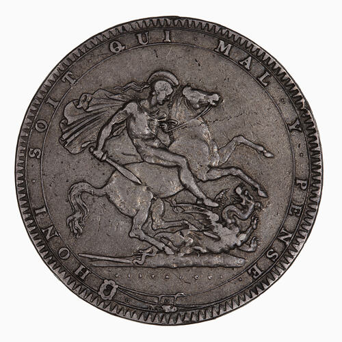 At centre St. George, wearing a helmet and cape and holding a sword, on horseback charging to right attacking a dragon lying below the horse with a broken lance in its side; in exergue in small letters, the artist's name, PISTRUCCI; encircling all, the Garter with motto HONI SOIT QUI MAL Y PENSE