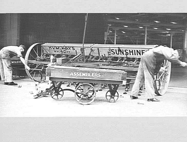 Workers assembling the undercarriage of a 'Suntyne' combine seed-drill cultivator. Note the self-contained portable trolley (labelled'assemblers') contained all the nuts, bolts, washers, etc. required for assembly.