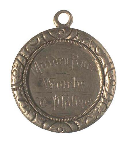 Other Details: This small silver medal was prepared for the annual company picnic of the Union Foundry in 1883. It was awarded for the 'Maiden Race' and was won by T. Phillips. The Union Foundry was started in Ballarat in 1863 to manufacture retorts for the local gas company, machinery for the Ballarat Meat Preserving Company and heavy castings for the Queensland sugar industry.
