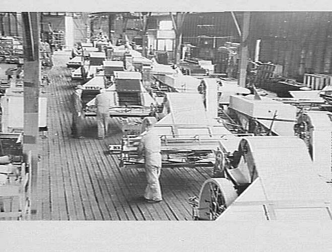 Assembly floor at Maylands, Perth, where choke-cutters are being fitted over the comb-fronts of 'A.L.' harvesters. (note the wooden floor.).