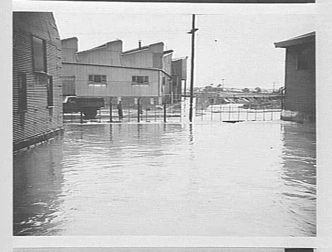Black and white image of a flood passing through the factory grounds on Hampshire Road behind the Woodmill (the saw tooth-roofed building). The flood emerged from nearby Stoney Creek.