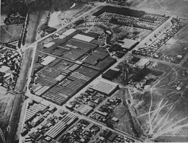 Black and white aerial photograph showing the H.V McKay Massey Harris factory in Sunshine in June 1943. The image includes views of the Melbourne-Sydney railway line, factory quarry (in the centre of the photograph), back shed and numerous Harvesters awaiting sale. On the left of Anderson Road, adjacent to the railway lin,e are stables which previously housed horses used by the factory.
