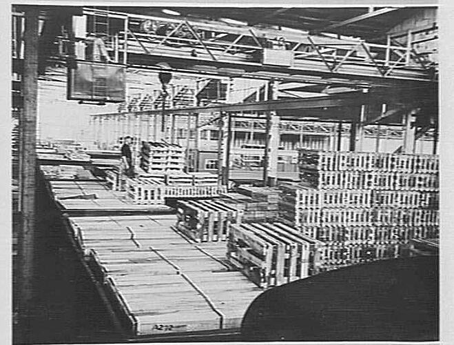 Photo shows train wagons loaded with binders for export to England. The binders were fully tested then dismantled and flat-packed in boxes for export. Note the overhead crane for lifting the crates.