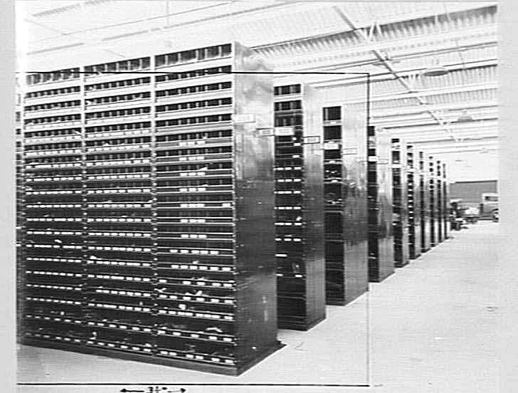 An interior view of a section of the duplicates department (spare parts), showing numbered racks for holding small spare parts.