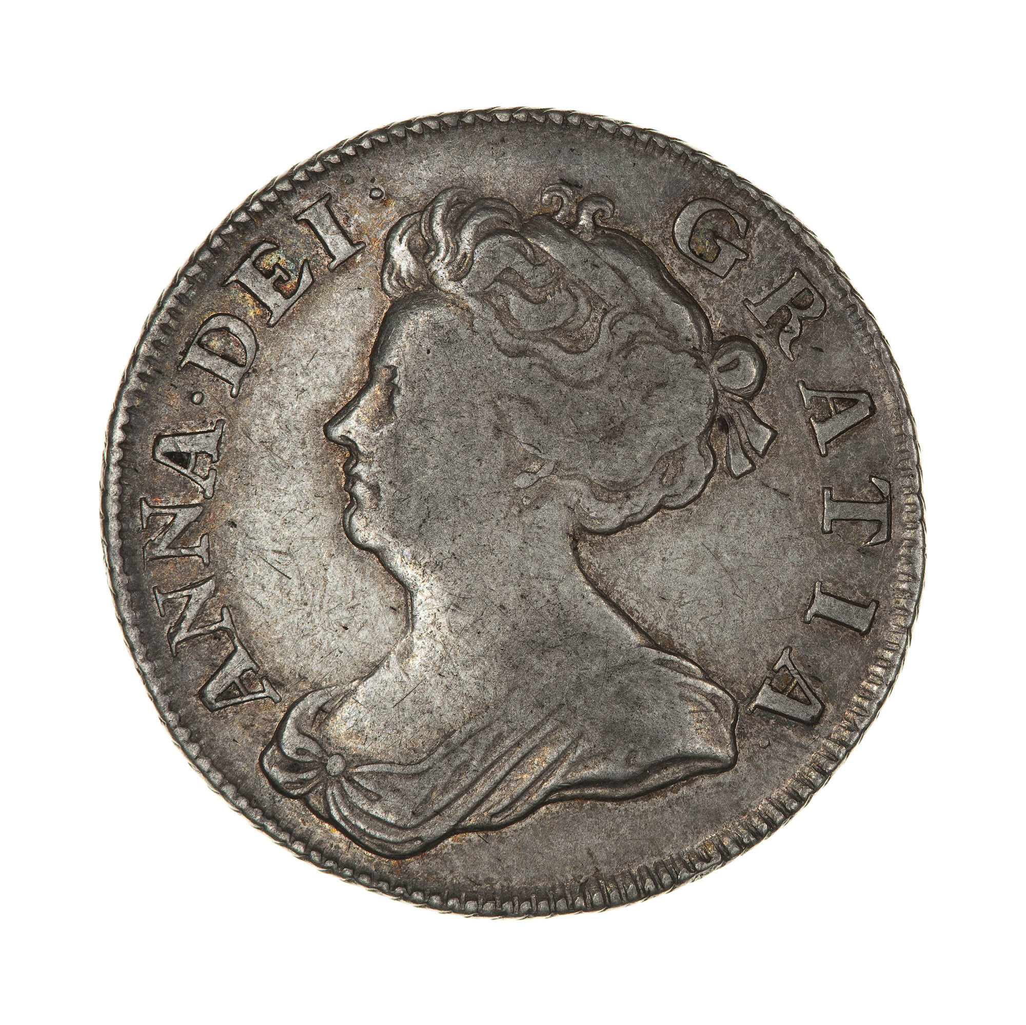 The legend reads as a single title from obverse to reverse and translates "Anne by the Grace of God Queen of Great Britain, France and Ireland". The plumes on the reverse record that this coin was made with silver from mines in Wales.