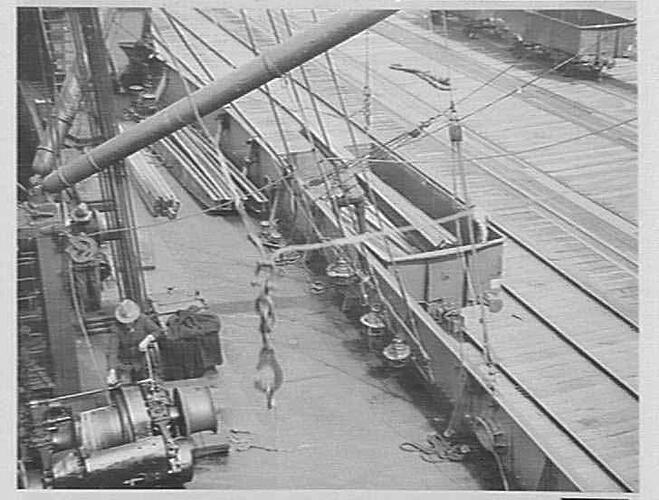 Photograph on the SS Lowanna showing the winch operator with overhead swing beam used for unloading from ship to shore.