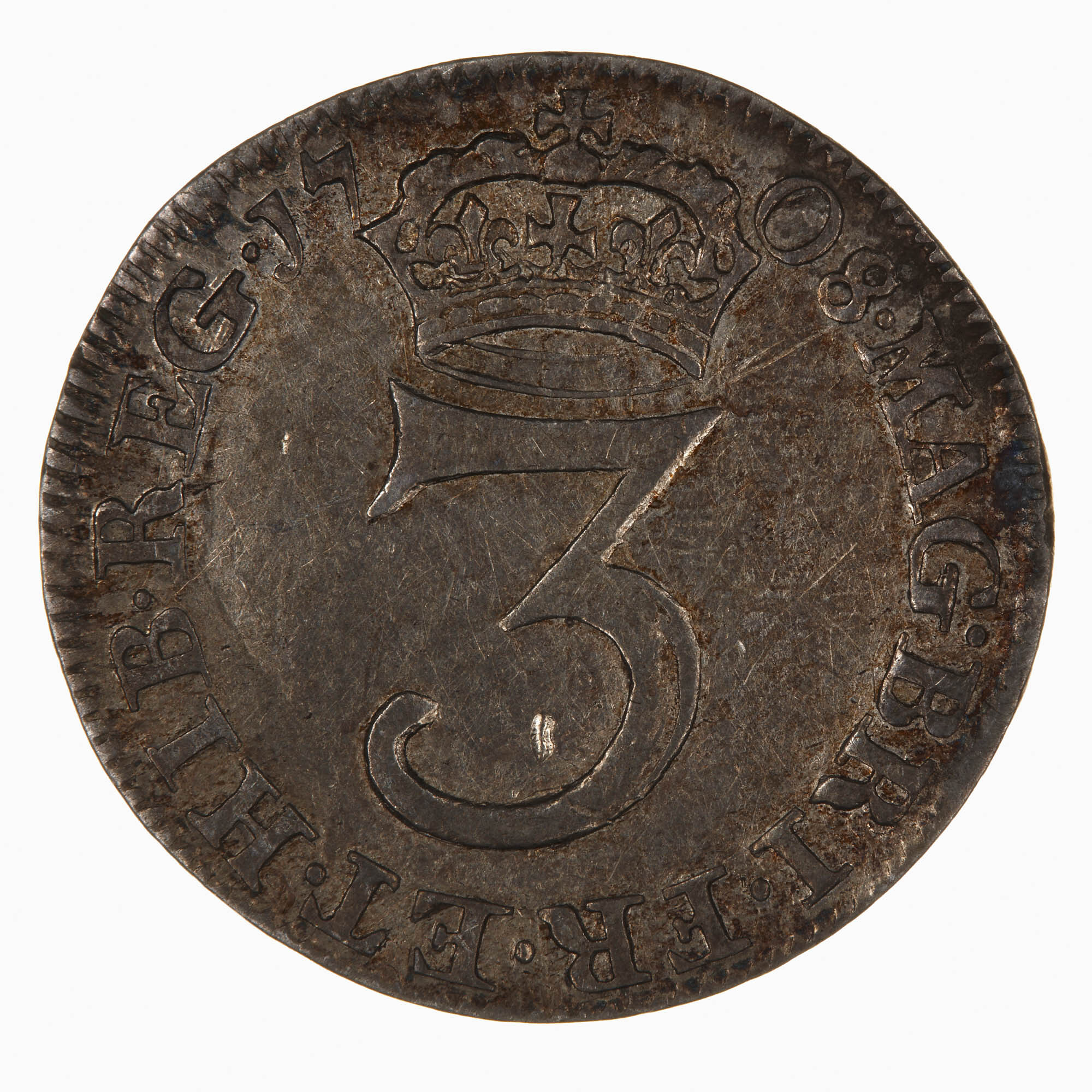 At centre, the numeral 3 crowned; around, MAG BR FR ET HIB REG 1708; the date divided by the crown
