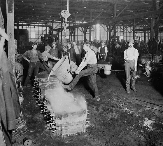 Two workers operating an overhead crane supported ladel and pouring molten metal into casting moulds. To the right is a smaller ladel being carried by two workers.
