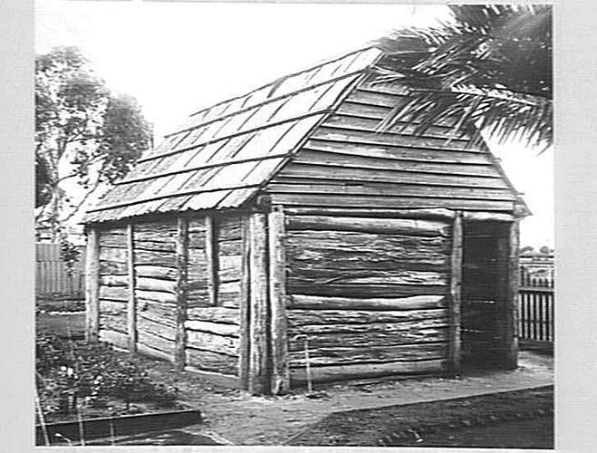 'The original farm smithy now in the grounds of the Sunshine Harvester Works'. Original wooden-slab smithy which was moved from Drummartin to the grounds of the factory at Sunshine in 1928.