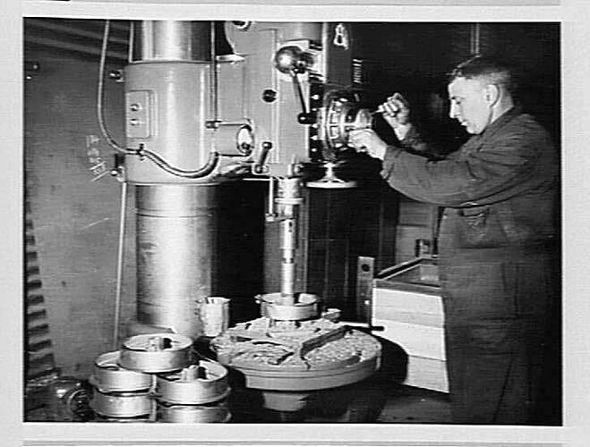 'Adcock & Shipley pillar drill, [stp 2] Sep 1954, No.1' heavy duty drill boring machine used for heavy drilling and boring of holes. Located in the Machine Shop drilling section.