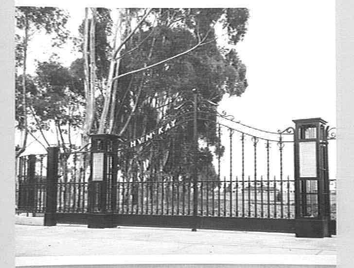 These gates formed the entrance to the 'Barclay Reserve' which was diagonally opposite the H.V. McKay memorial gardens. Mr Reg Barclay was a McKay employee and an ex-mayor of Sunshine. The gates were removed for road realignment in the mid-1970s, and rein.
