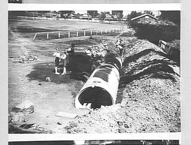 Air raid shelters being prepared in Railway Reserve opposite clock tower (for use of works employees). The holes for the shelters were all dug by hand by H.V. McKay employees.