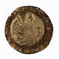 Crowned half-length figure of the King facing right wearing decorated armour and holding a sceptre tipped with a lis and orb; around, (Mm. trefoil) IACOBVS D G MA BRI FRA ET HI REX (translation: James by the Grace of God King of Great Britain France and Ireland)