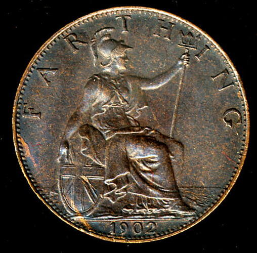Britannia seated facing right on a rock wearing a helmet and flowing robes; she holds a trident and rests her right hand on a shield which bears the combined crosses of the Union Flag; around, ONE PENNY; in exergue, 1902