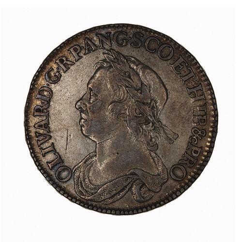 Laureate and draped bust of Cromwell facing right; around, OLIVAR D G R P ANG SCO HIB &c PRO