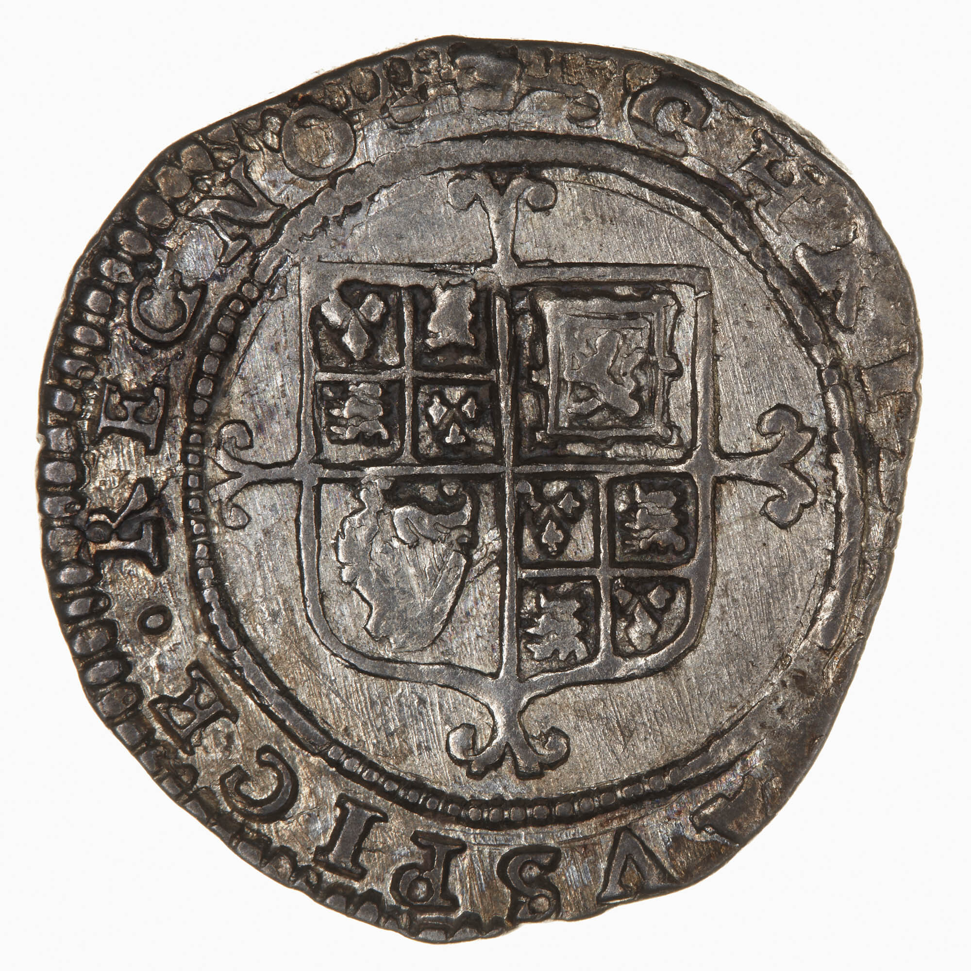 Within an inner circle, a square topped shield quartered with the arms of England and France combined (in 1st and 4th quarters), Scotland and Ireland, on a cross fleury; around, (mm. crown) CHRISTO . AVSPICE . REGNO . (translation: I reign under the auspices of Christ)