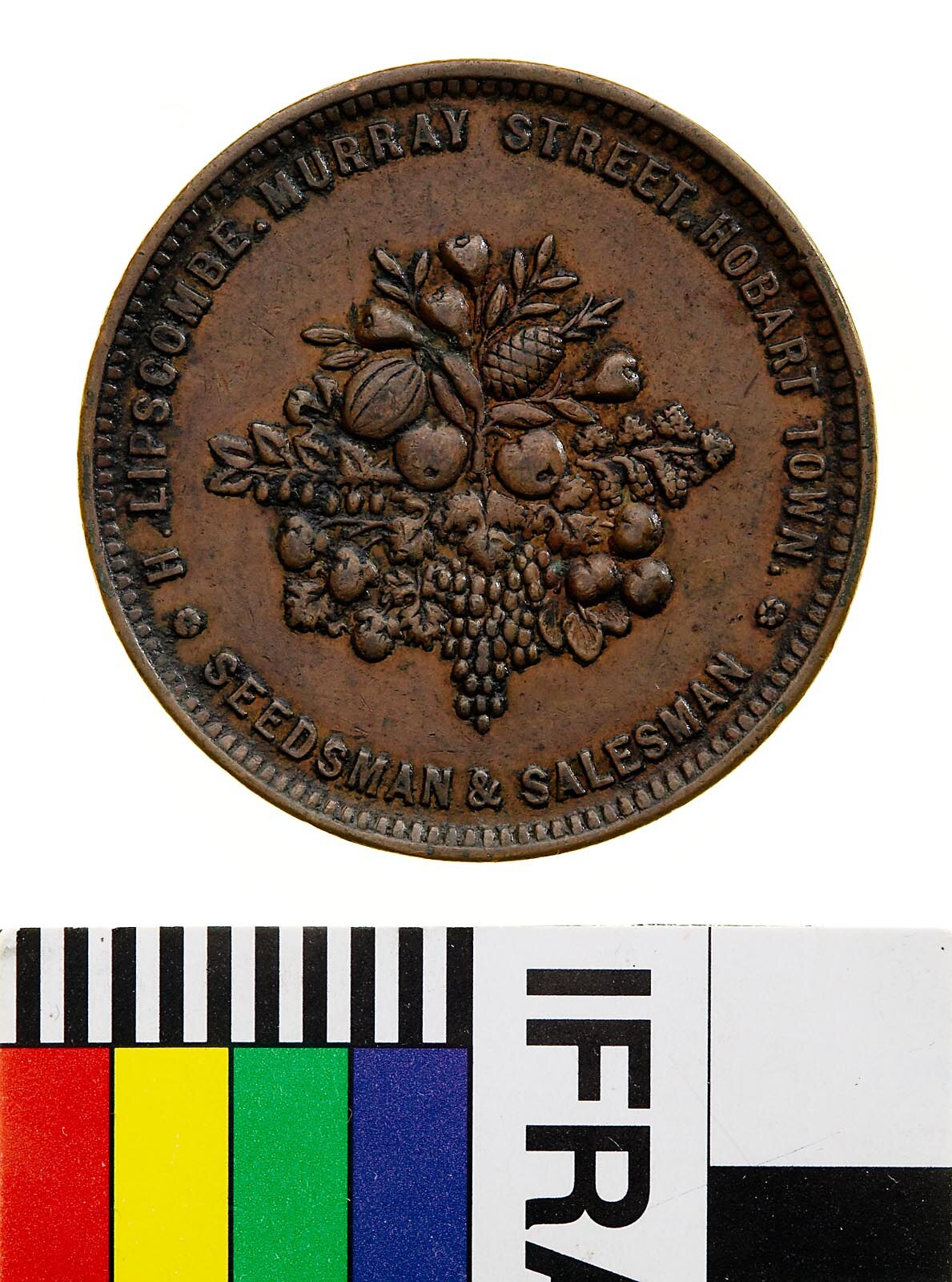 A round copper token (34 mm diameter) featuring the name, address and business of the issuer: H. Lipscombe, Murray St. Hobart Town, seedsman, salesman and shipping supply agent. It features a bouquet of produce that includes grapes, apples, pears, mellon and pineapple.