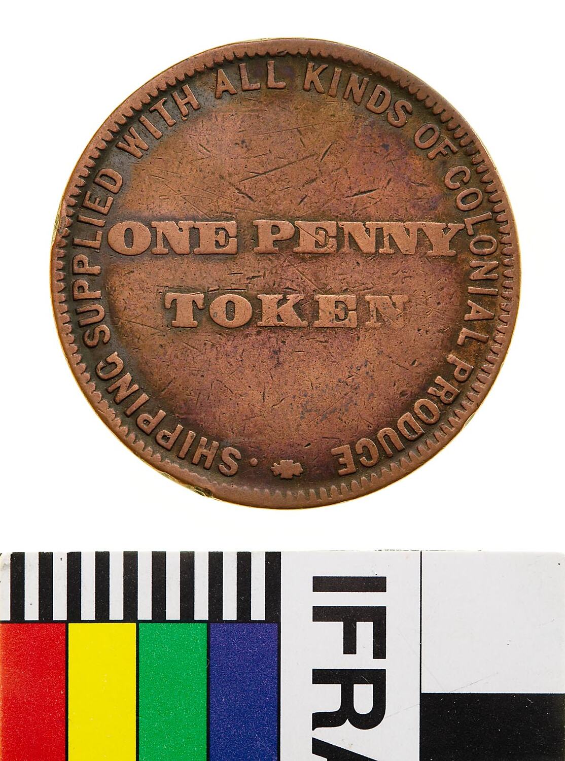 Across centre in two lines, ONE PENNY / TOKEN around, . SHIPPING SUPPLIED WITH ALL KINDS OF COLONIAL PRODUCE *