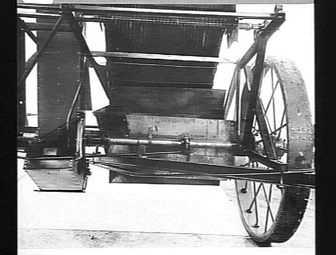 ''Suntip ' chaff saver: Nov 1928' the chaff saver was an optional extra. The chicken wire screen shown protects the working mechanism from the chaff. At the lower end of the elevator can be seen the plain grain cups which carried the grain to the screen.