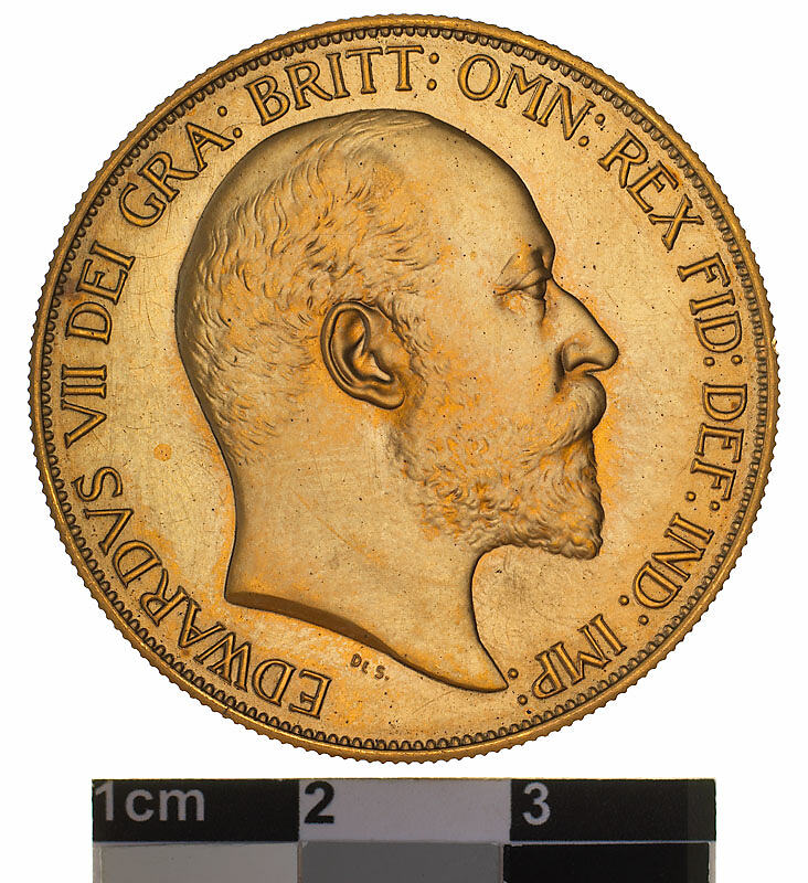 A gold coin (36 mm diameter with milled edge) featuring a bare head of King Edward VII facing right; around, EDWARDVS VII D:G: BRITT: OMN: REX F:D: IND:IMP: below the head in tiny letters the artist's initials DES. The reverse features St. George on horseback holding short sword, the horse rearing to right over a fallen dragon which has a broken lance in its chest; in exergue, the date, 1902. The mint mark S is in the ground above the middle of the date.