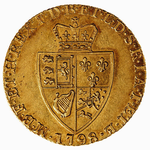 Crowned spade-shaped shield quartered with the arms of England and Scotland impaled, France, Ireland and the Electorate of Brunswick and Luneburg; around, M B F ET H REX F D B ET L D S R I A T ET E; below shield, 1794. (translation from obverse to reverse, George III by the Grace of God King of Great Britain, France and Ireland, Duke of Brunswick and Luneberg, Archi-Thesaurius and Elector of the Holy Roman Empire).