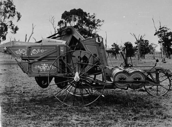 This is the third prototype header-harvester built by Mr H.S. Taylor on the family farm, 'Emerald Hill', near Henty, N.S.W., 1914. (His first Model was built in 1911.) A restored Model of this is housed in a glass-enclosed building at 'Memorial Park', Henty.