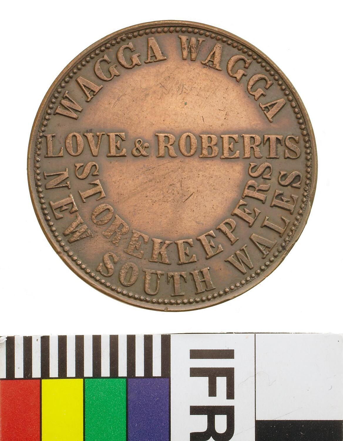 A round copper token (34 mm diameter). The token gives the name and address of the issuer, Love & Roberts, Storekeepers at Wagga Wagga and of the manufacturer: T. Stokes, Melbourne together with the date of issue, 1865. It depicts a plough on the reverse. Lightly cleaned.