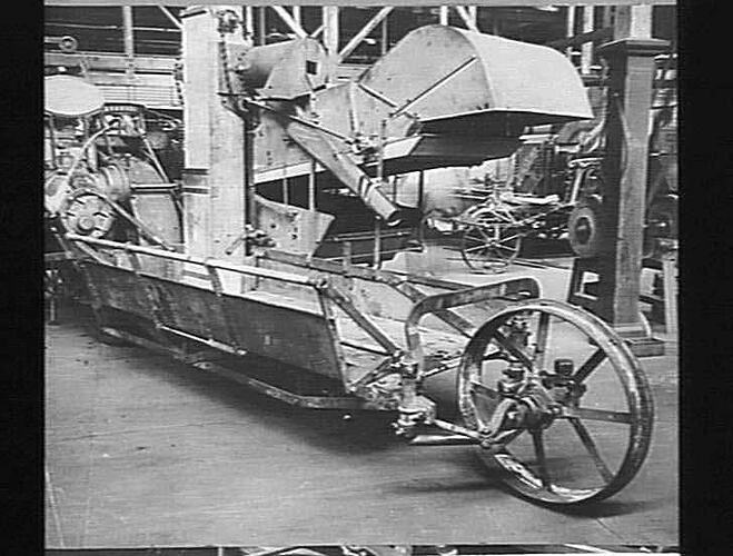 An experimental auto header, powered by a 'Fordson' tractor engine, on the assembly line in the Sunshine factory