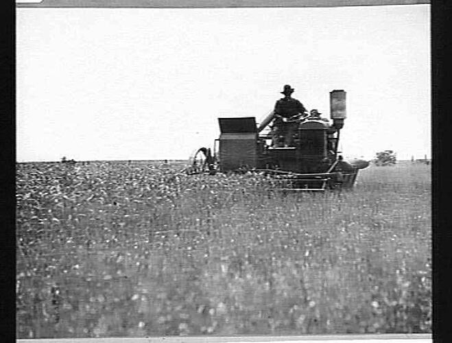 Experimental Sunshine auto header, fitted with 'Fordson' engine, working in the field. Note the large screen to keep chaff and straw away from the hot exhaust pipe. Designed by H.S. Taylor.