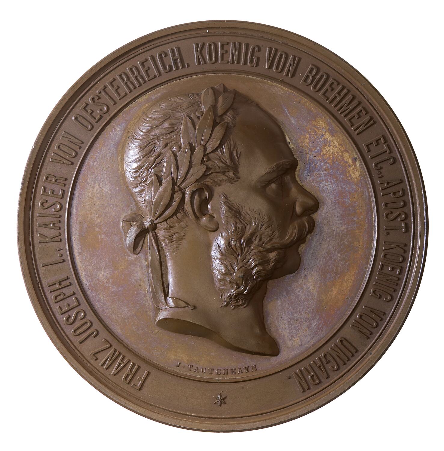 Head of Frans Joseph, laureate right; around, FRANZ JOSEPH I., KAISER VON OESTERREICH, KOENIG VON BOEHMEN ETC., APOST. KOENIG. VON UNGARN. * and below head in small letters the artist's name J. TAUTENHAYN