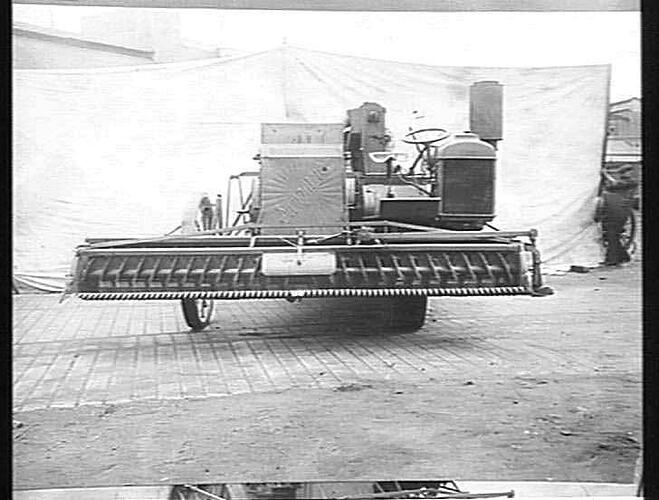 'Fordson '-powered auto header - a self propelled grain harvester developed at the Sunshine factory. Note the spirals on the left and right have reverse actions to enable the crop to be fed directly into the grain elevator and threshing drum.