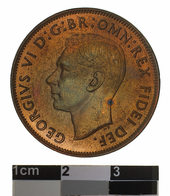 A bronze coin (30.8 mm diameter with plain edge) featuring a bare head of George VI facing left; around, GEORGIVS VI D:G: BR: OMN: REX FIDEI DEF. ; below head in small lettering the artist's initials HP. The reverse features a kangaroo leaping to the left; around above AUSTRALIA, around below, PENNY. ( the small dot after the word PENNY is the mint mark for Perth for this issue); the Federation star is in the field to the left of the kangaroo and the date, 1950 is in the field below its tail. The artist's initials KG are above the tip of the tail.