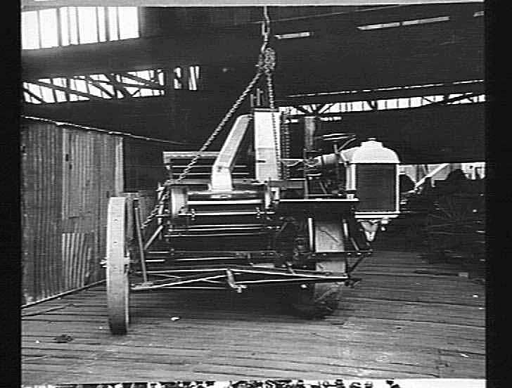 A Fordson-powered auto header under the crane packed ready for trans shipping.