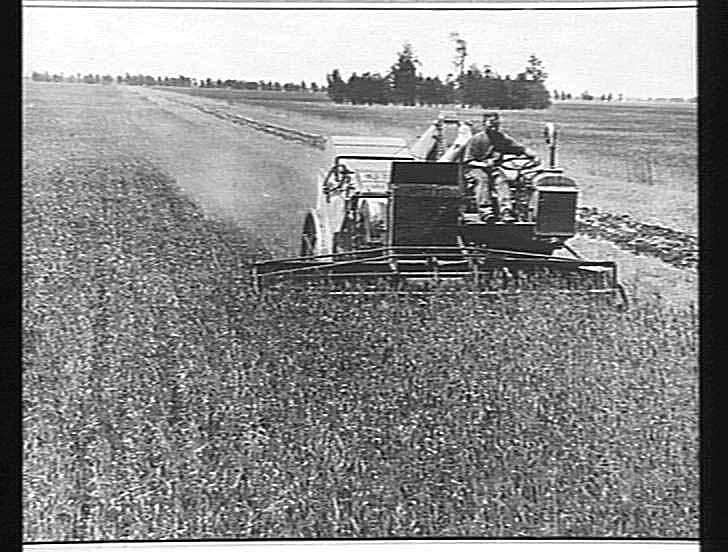 "AUTO HEADER AT WORK: JULY 1927" A `W' TYPE FORDSON-POWERED AUTO HEADER WORKING IN FIELD.