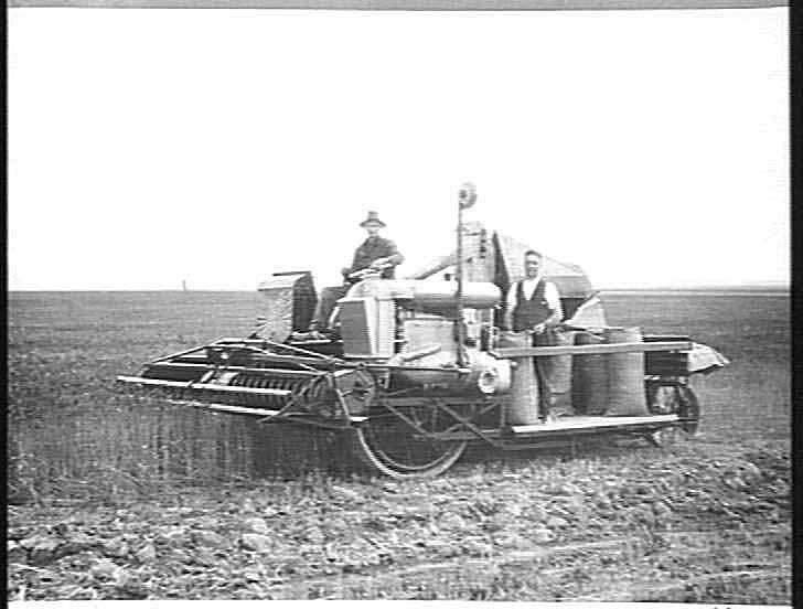 A 'W' type Fordson-powered auto header, fitted with McKay spark arrestor, working in the field. Note the bags of grain on the straight bagging platform and the empty bags on the bag carrier at rear.