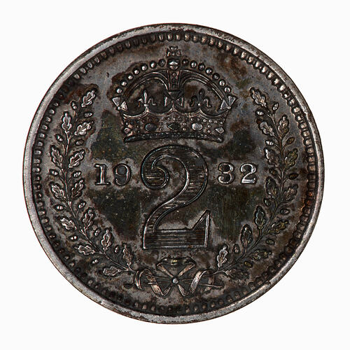 Within an open oak wreath the numeral 2 dividing the date 1932; above, crown.