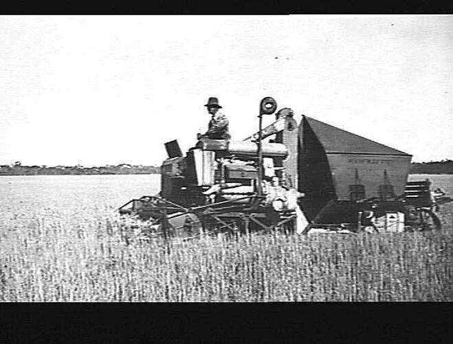 'W ' type auto header fitted with large grain box harvesting wheat on the York Peninsula, S. A..