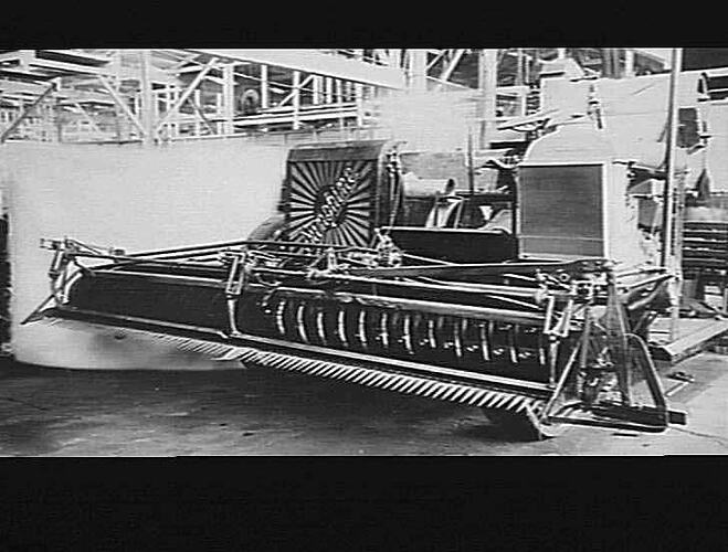 Front view of a 14 ft 'W' type'Fordson' engine-powered auto header fitted with a choke cutter for harvesting in weed and thistle-infested crops.