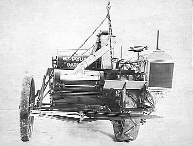 A Hedley S. Taylor designed and patented Fordson-powered auto header on slings ready for transportation.