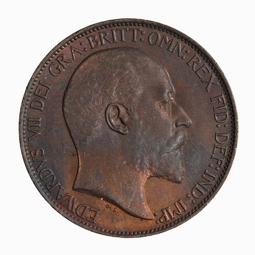 Bare head of the King facing right; below in small letters De S. (for G.W. De Saulles Mint Engraver); around, EDWARDVS VII DEI GRA: BRITT: OMN: REX FID: DEF: IND: IMP:
