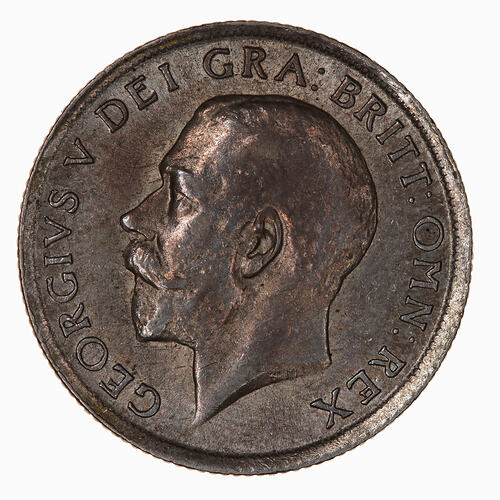 Bare head of the King facing left; below on neck truncation in small letters, B.M. (Bertram MacKennal); around, GEORGIVS V DEI GRA: BRITT: OMN: REX