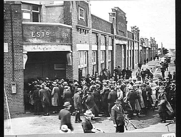 Black and white photograph of farmers arriving at the entry to the factory showrooms on the corner of Devonshire Road, beneath the original clock tower, on their tour of inspection in 1925.