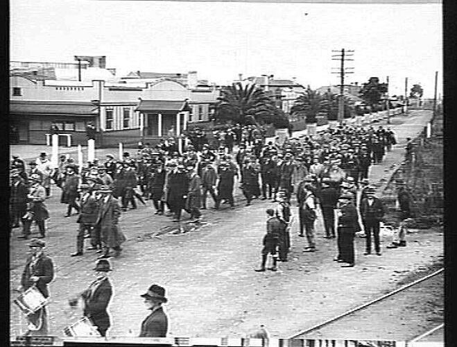 Black and white photograph of members from the Chamber of Commerce on their way to the Sunshine Harvester Works for an inspection of the site. They came from the Sunshine railway station.