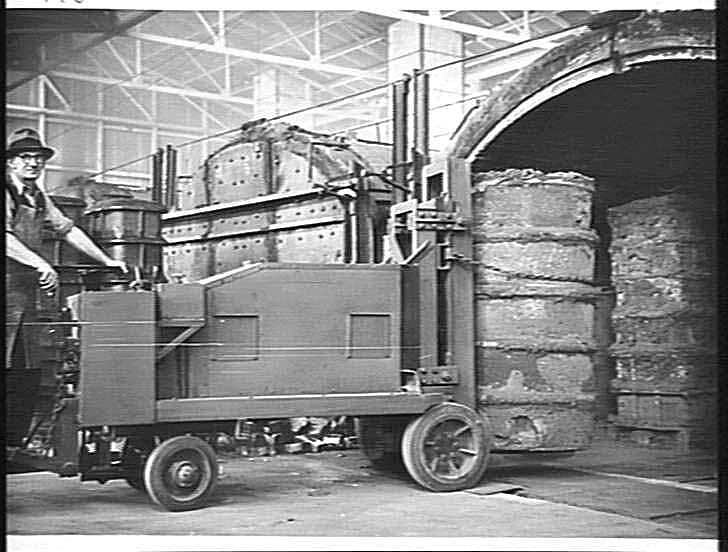 Black and white photograph of a man operating a battery-powered forklift. He is loading a charge of pre-packed white-iron castings into the malleable-iron furnace for treatment. The furnace process took seven days to convert white-iron castings into malleable-iron castings. The forklift was made in the H.V McKay Massey Harris Sunshine factory.
